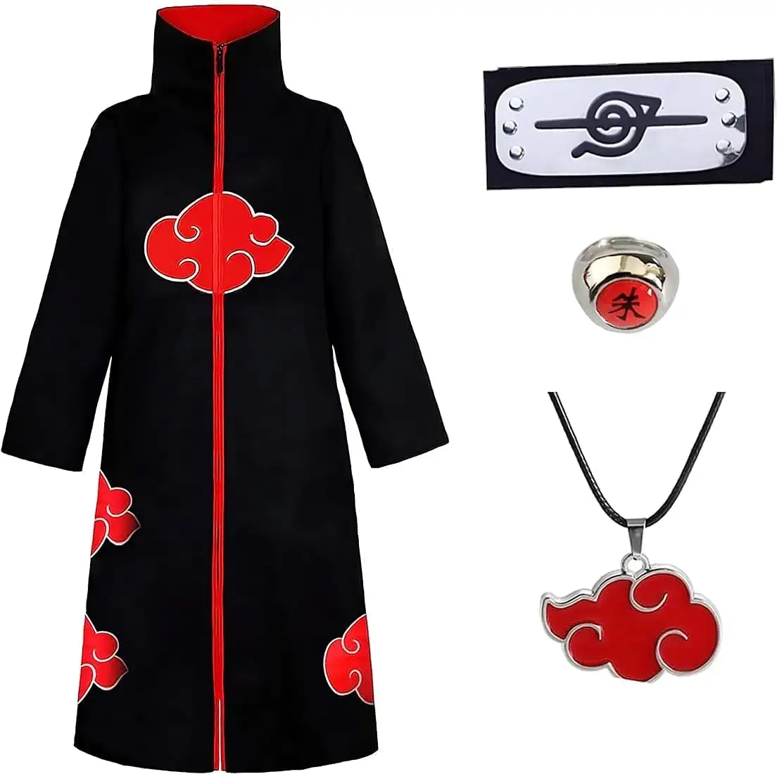 Akatsuki Cloak Costume for Cosplay Naruto Costume Black | Anime Collectible | Necklace | Itachi Uchiha Akatsuki Ring | Anime Merchandise Bundle | Perf...