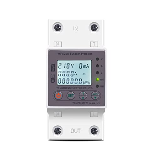 amiciSmart WiFi Energy Meter with Over/Under Voltage, Leakage and Over Current/Load Protection, Timer Switch Compatible with SmartLife App, Din Rail Mounted