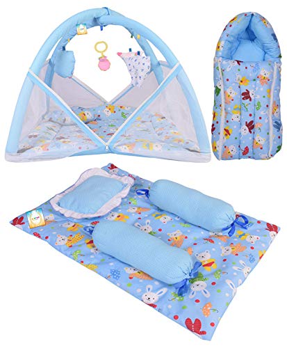 Bantoo New Born Baby Bedding Set Combo of Mattress with Net Sleeping Bag & 4 Pcs Gaddi Set (0-6 Months Blue)