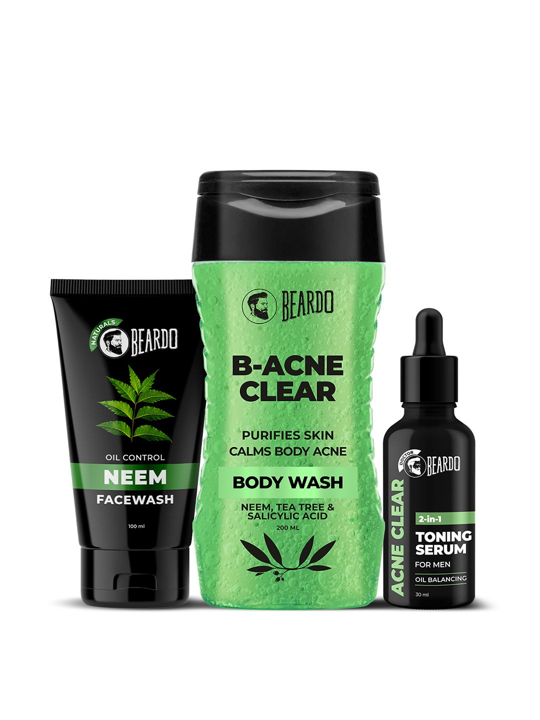 BEARDO Men Oil Control Neem Facewash 100ml+ B-Acne Clear Bodywash 200ml+ Toning Serum 30ml
