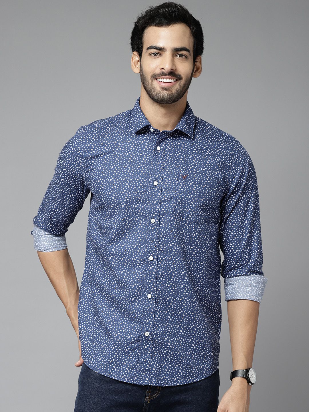 • Navy blue White micro ditsy printedopaque Casual shirt, has a spread collar, button placket, 1 patch pocket, long regular sleeves, curved hem,India Slim Fit