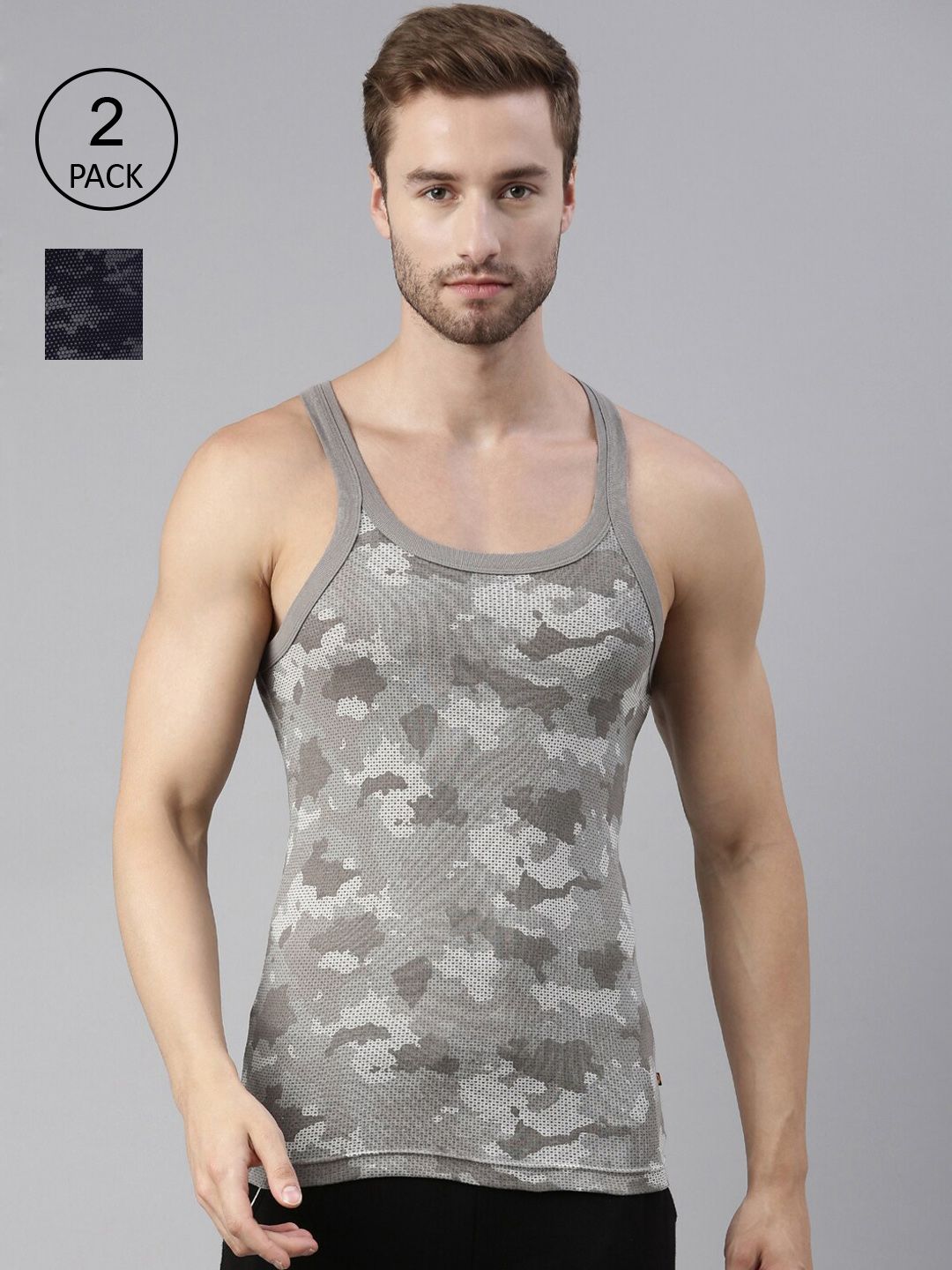 • Pack of 2 grey and black printed innerwear vests apple cut innerwear vests, has a round neck and sleeveless