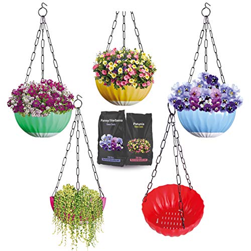 DOAP Plastic Big Hanging Pot & 2pc Hybrid Flower Seeds -Self Watering Planter, Multicolor, 8.5 inch, 5 Piece