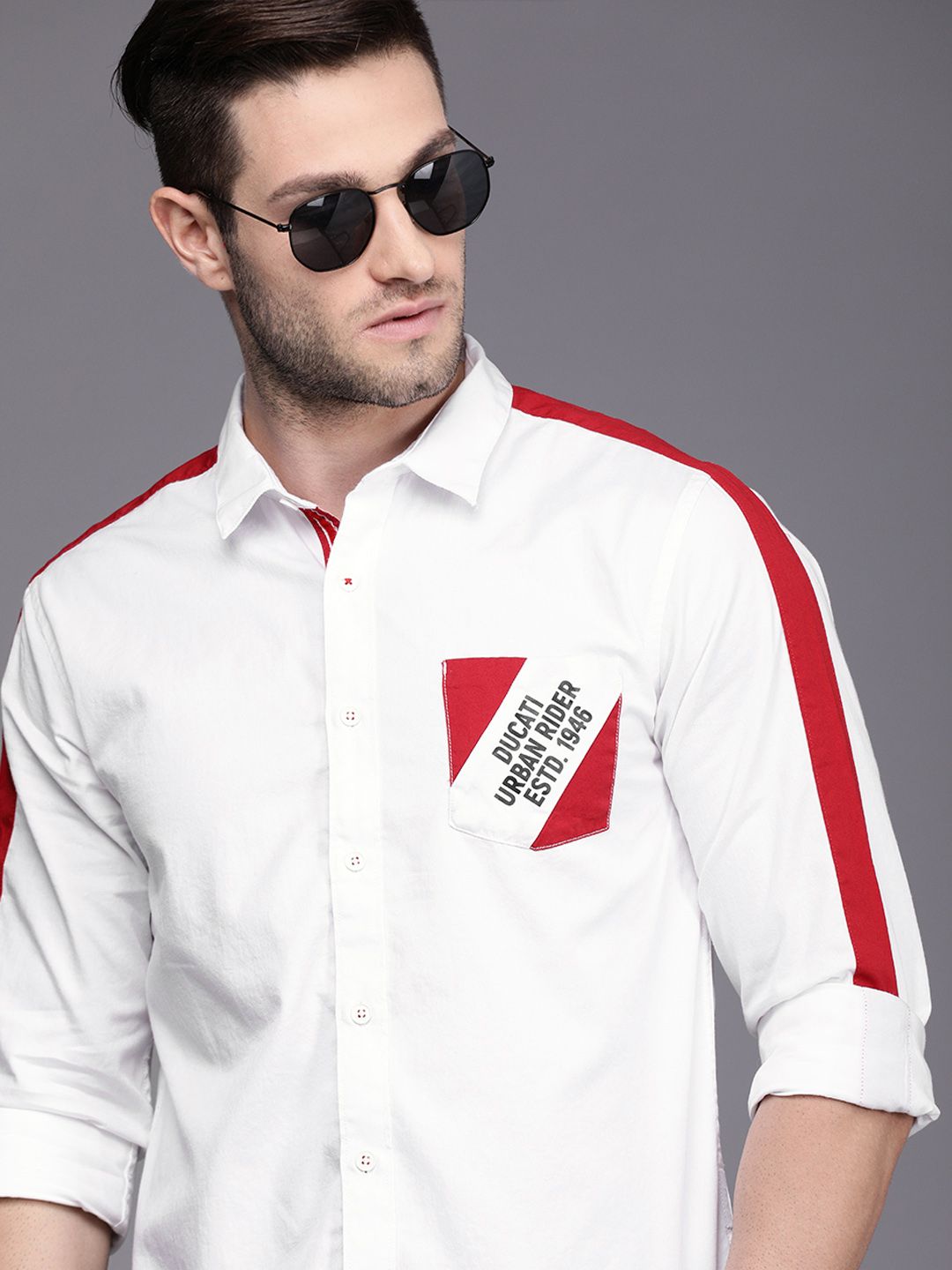 Ducati Men White Solid Pure Cotton Casual Shirt with Side Taping