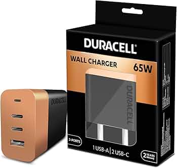 Duracell 65W GaN Fast Wall Charger/Adapter, Triple Port, USB A, 2 PD Port with USB-C, Ultrafast Mobile Charger Compatible with iPhone, Android, iPad, ...
