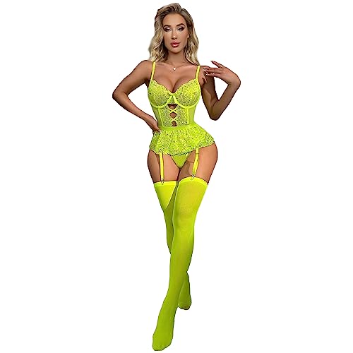 Elecurve Lime Green Sheer Mesh Embroidered Lingerie Set with Garter Belt and Stockings for Women