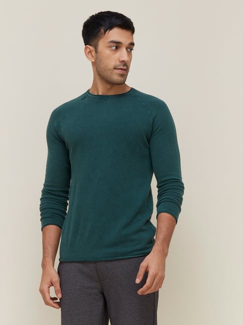 • [Slim fit, Self, Machine Wash, Emerald Green, Model is 6ft 0in/183cm and is wearing a Medium, Crew neck, Full Sleeves, 100% Cotton]