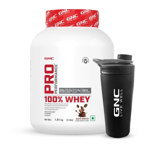 GNC Pro Performance 100% Whey Protein Powder & Steel Shaker (Café Mocha, 4 lbs with Shaker)
