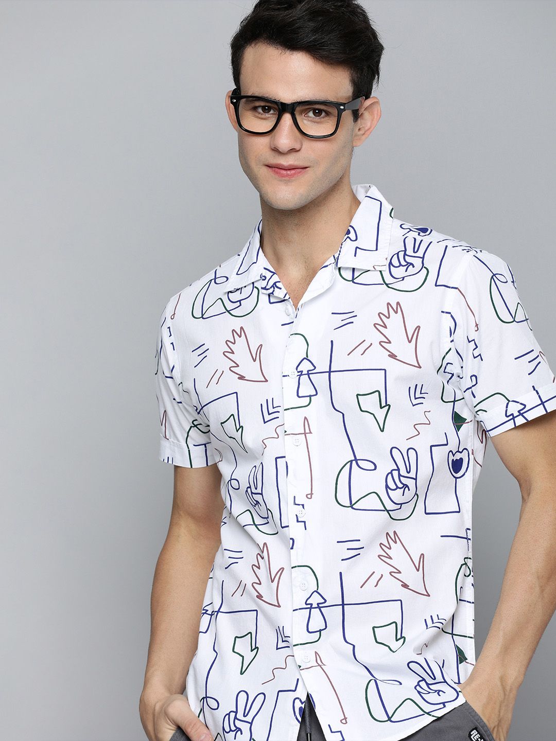 HERE&NOW Men White Cotton Slim Fit Printed Sustainable Casual Shirt