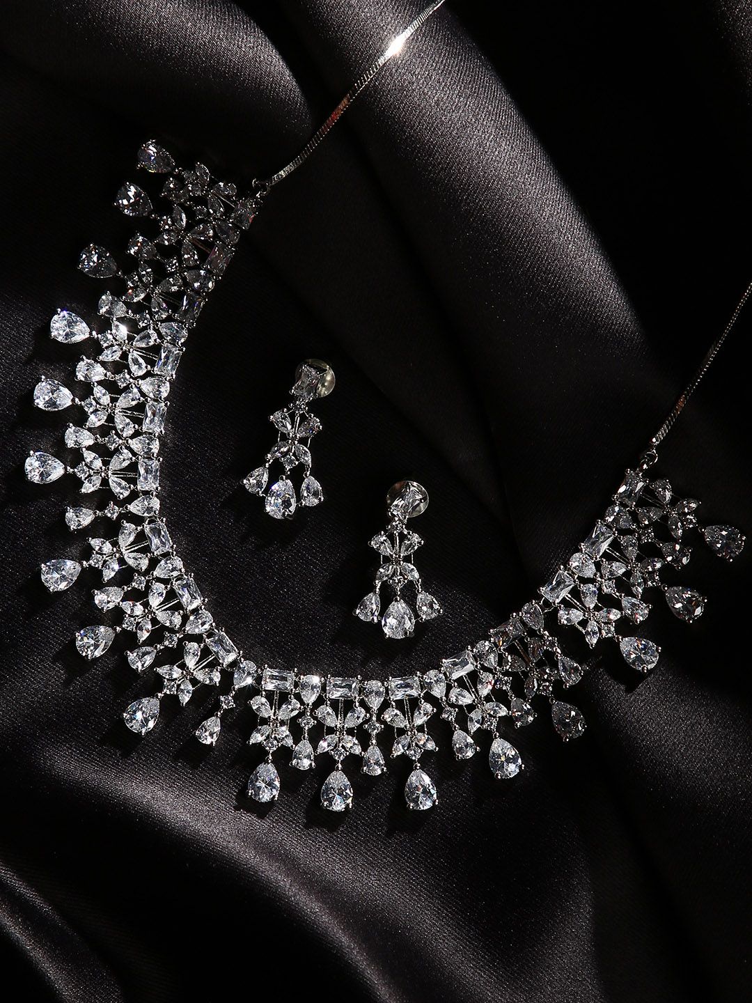 • This jewellery set consists of a necklace and a pair of earringsSilver rhodium-plated necklace, has American Diamond studded, secured with a hook closureA pair of matching drop earrings, secured with post and back closure