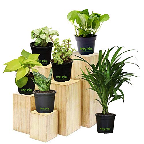 Leafy Tales Set of 6 Air Purifying Plants Combo- Areca Palm, Sansevieria Green, Golden Money Plant, Button Jade and Dwarf Syngonium in Black Plastic P