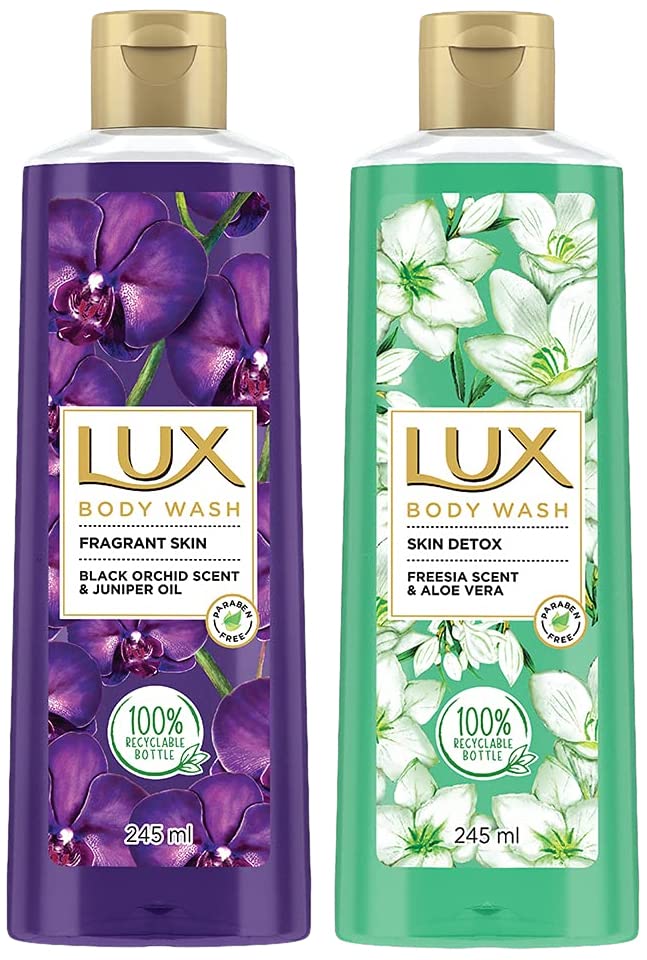 Lux Shower Gel, Freesia Scent & Aloe Vera Bodywash, Skin Cleanser With Long Lasting Fragrance, Paraben Free, 245 ml & Lux Shower Gel, Black Orchid Fragrance & Juniper Oil Bodywash, 245 ml