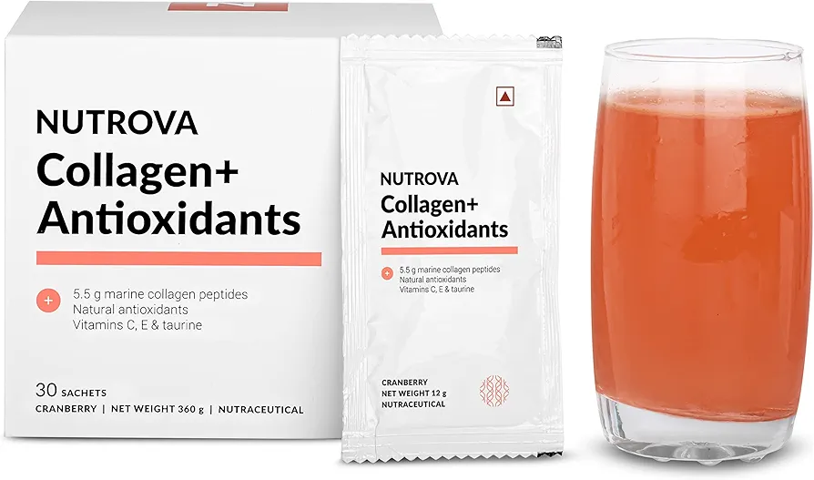 NUTROVA Collagen+Antioxidants Supplement - 30 Sachets of Marine Collagen Powder for Men & Women, Increases Skin Hydration, Reduces Skin Damage, Supports Healthy Skin, Hair & Nails, Cranberry Flavour