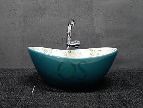 OSAM IMPORTED Premium Designer Table Top Ceramic Wash Basin/Vessel Sink with Slim Rim for Bathroom (L-410 X W-335 X H-150 (MM), SYAN GREEN TONE MARBLE, Glossy Finish)