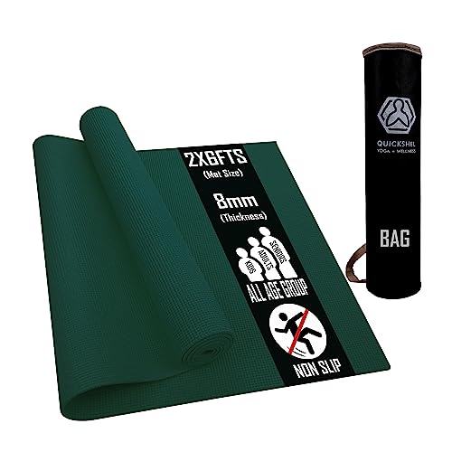 Quick Shel Extra Thick 8mm Thickness Yoga mats Exercise Mat Anti-Skid Water/Dirt Proof Lightweight easy to Carry for home and gym workouts for men women children with Carry Bag (Army Green) (2fts x 6fts)