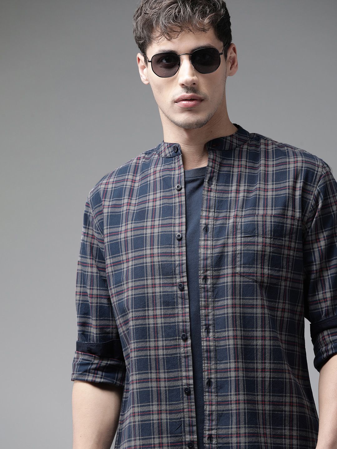 Roadster Men Navy Blue & Off White Tartan Checked Pure Cotton Sustainable  Shirt