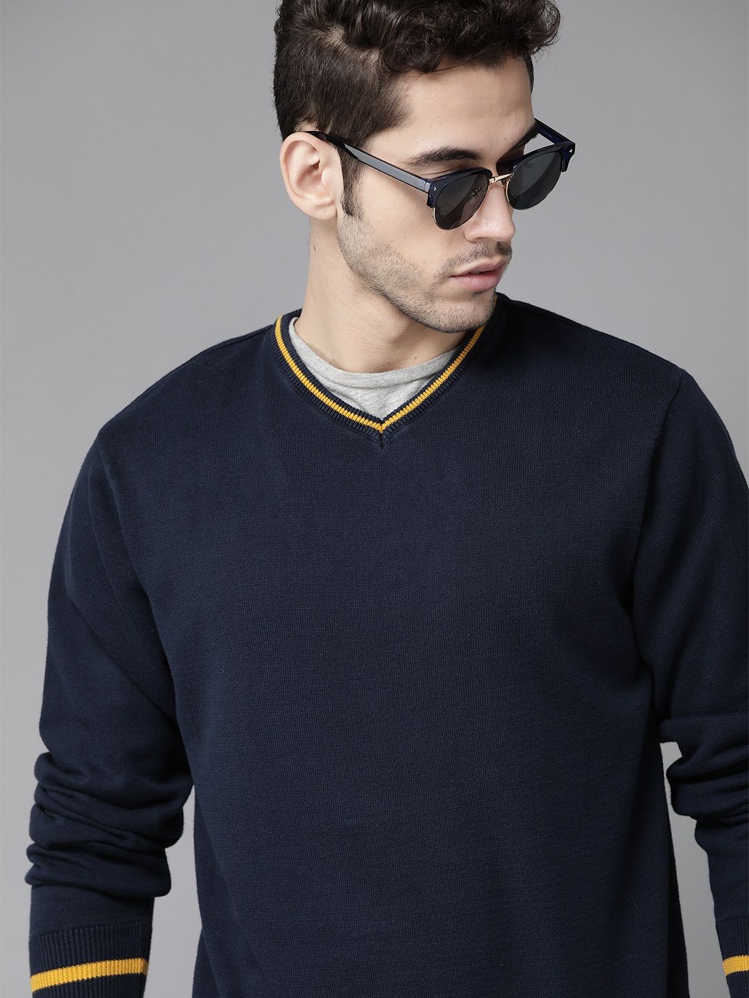 Roadster Men Navy Blue Solid V-Neck Pullover
