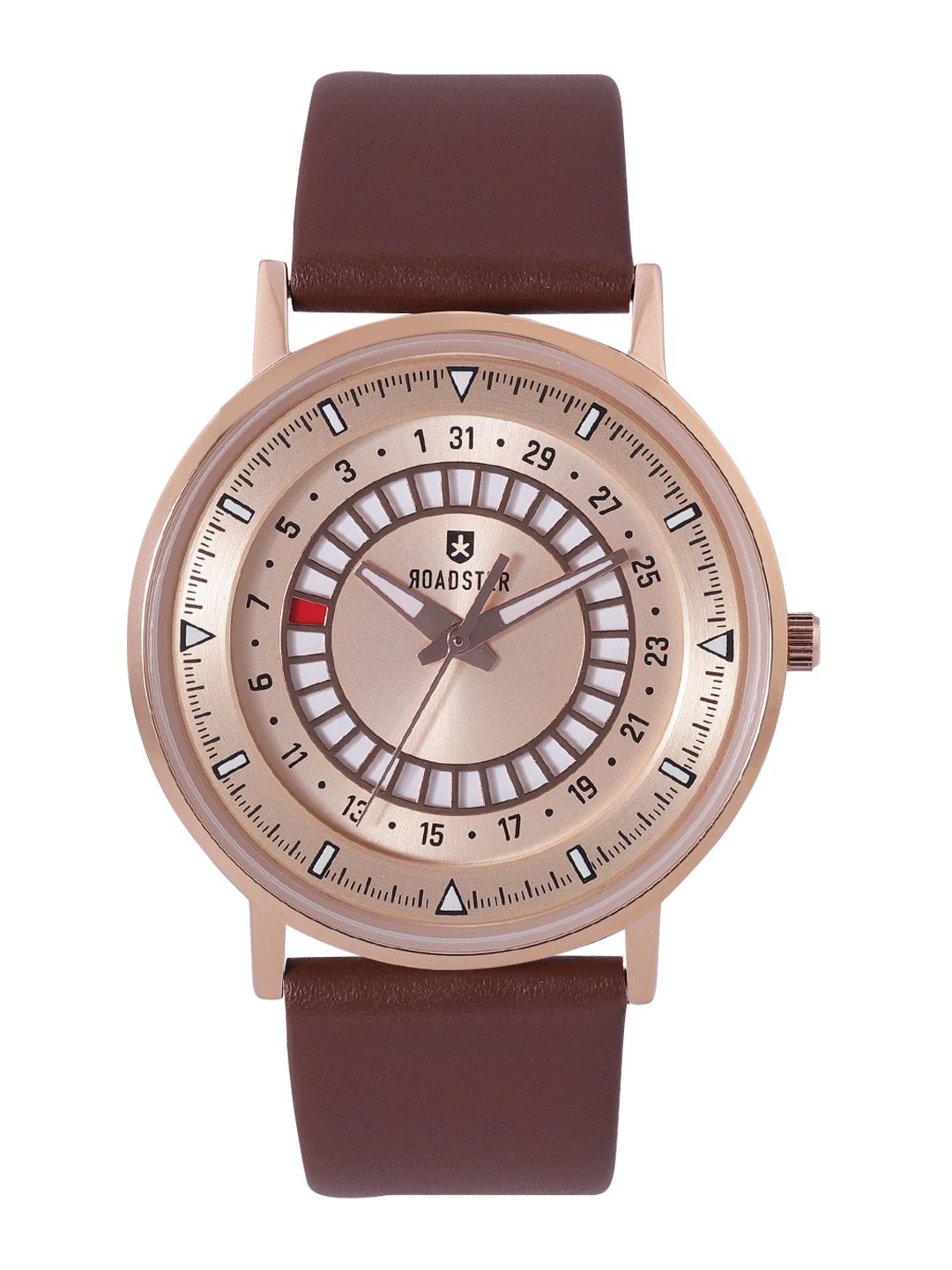 Roadster Men Rose Gold-Toned Brass Embellished Dial & Brown Leather Straps Analogue Watch