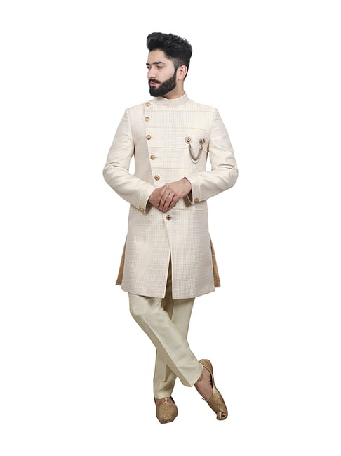 SG RAJASAHAB Cream Printed Regular Fit Sherwani Set