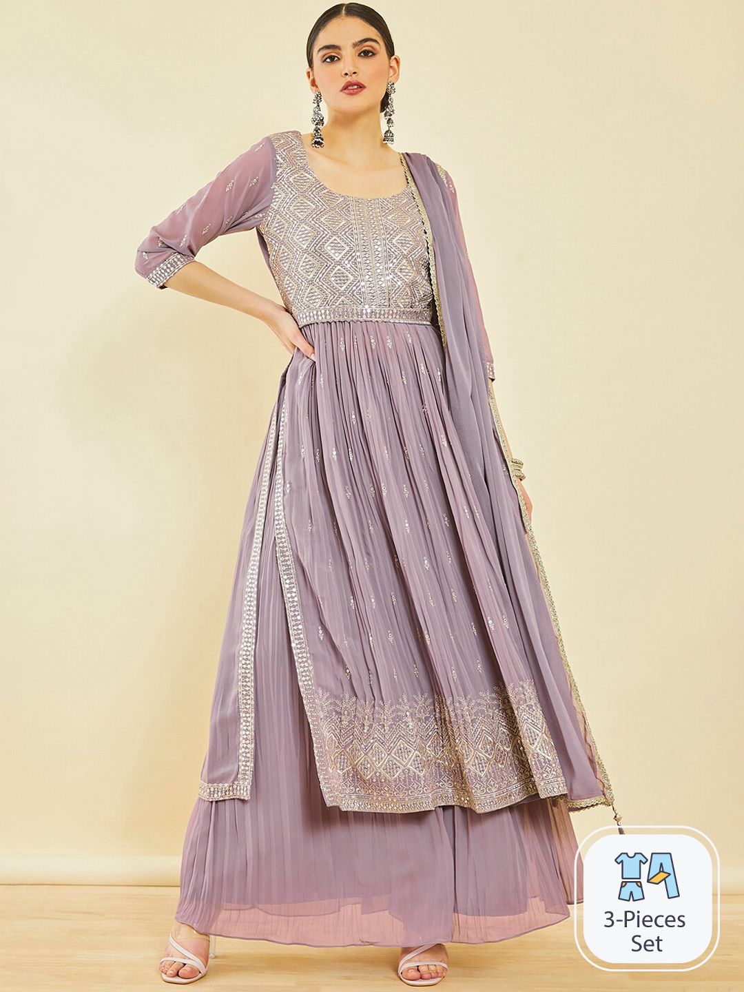 Price History ofSoch Ethnic Motifs Embroidered High Slit Sequinned Kurta with Palazzos & Dupatta