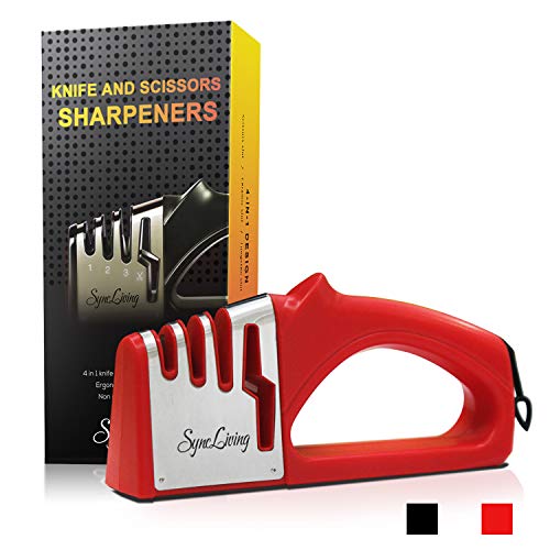 Sync Living Knife and Scissor Sharpeners,4 Stage Knife Sharpener, 4-in-1 Knife and Scissors Sharpener with Diamond, Ceramic, Tungsten, Kitchen Tools for Kinds of Knives, Red