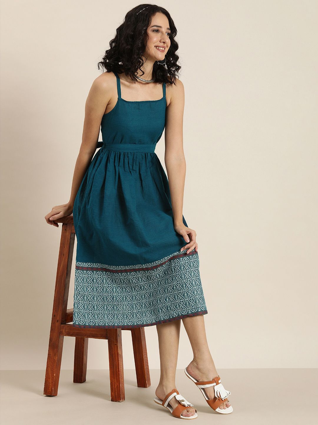 Taavi Women Teal & White Woven Legacy Shoulder Strap Pure Cotton Midi Dress