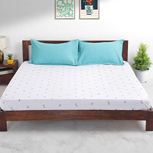 Teal by Chumbak Sahara Desert Floral Double Bedsheet - Queen Size with 2 Pillow Covers, 144TC, 100% Cotton, White & Teal