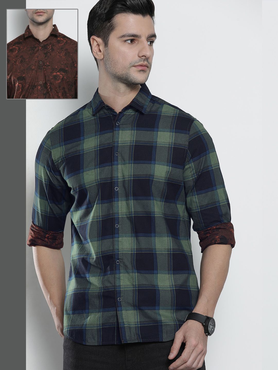 Price History ofThe Indian Garage Co Men Green & Rust Orange Reversible Checked & Floral Cotton Shirt
