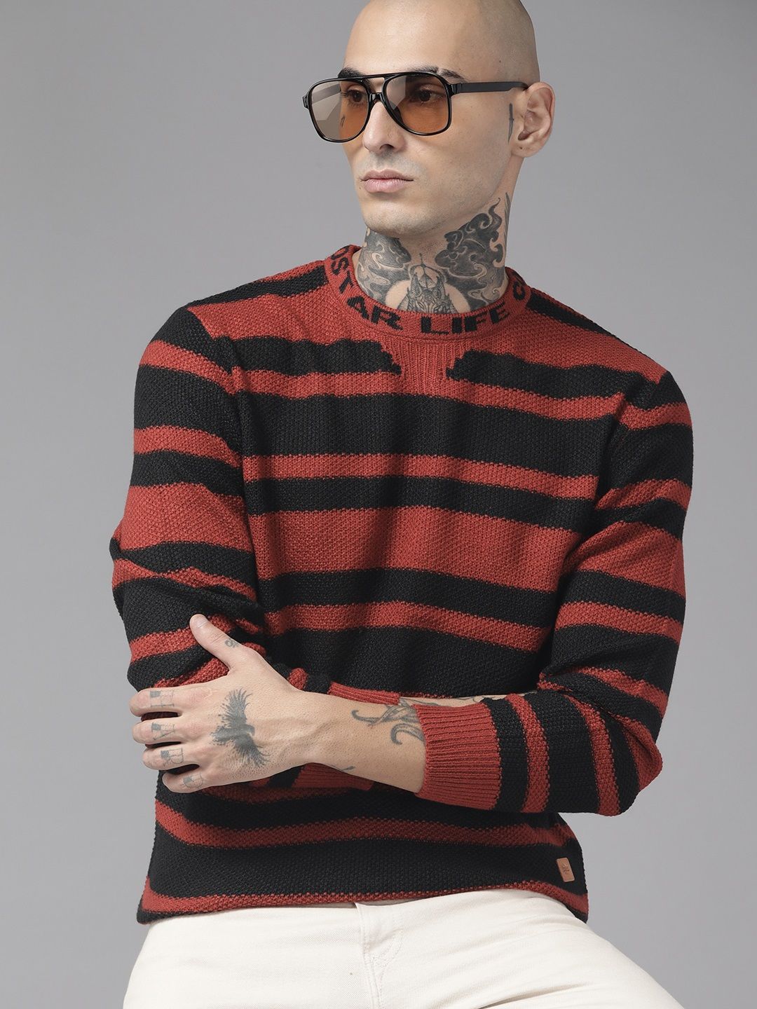 The Roadster Lifestyle Co. Men Rust Brown & Black Striped Acrylic Pullover