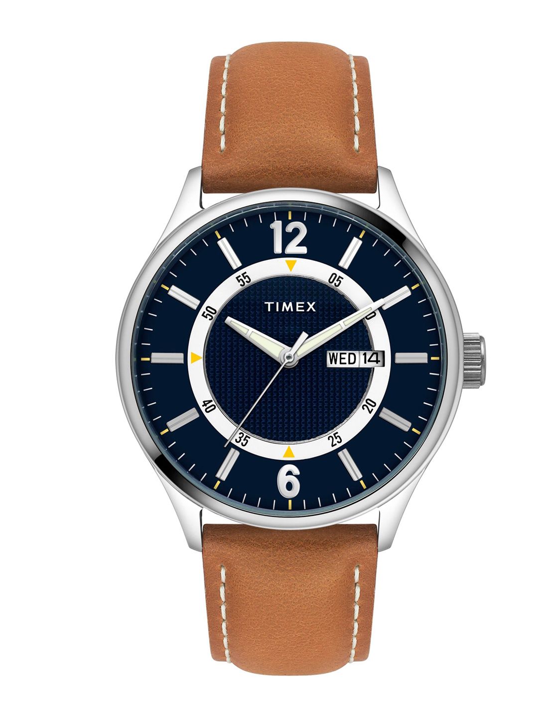• Display: AnalogueMovement: QuartzPower source: BatteryDial style: Solid round stainless steel dialFeatures: Reset Time, Date ApertureStrap style: Brown regular, leather strap with a tang closureWater resistance: 30 mWarranty: 1 yearWarranty provided by brand/manufacturer Comes in a signature Timex case