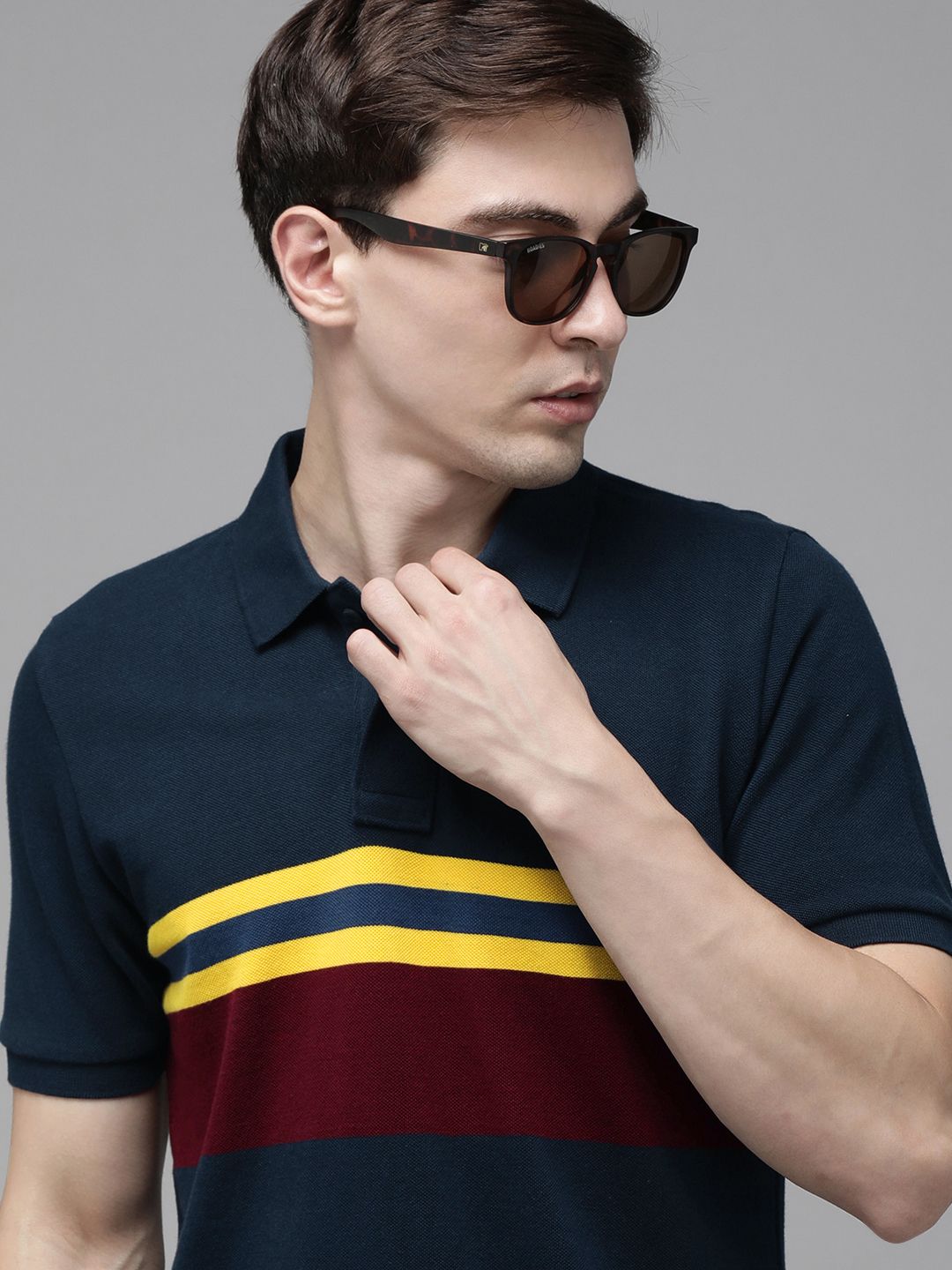 • Navy blue and yellow Tshirt for menStripedRegular lengthPolo collarShort, regular sleevesKnitted cotton fabricA small logo detailing on chestButton closure