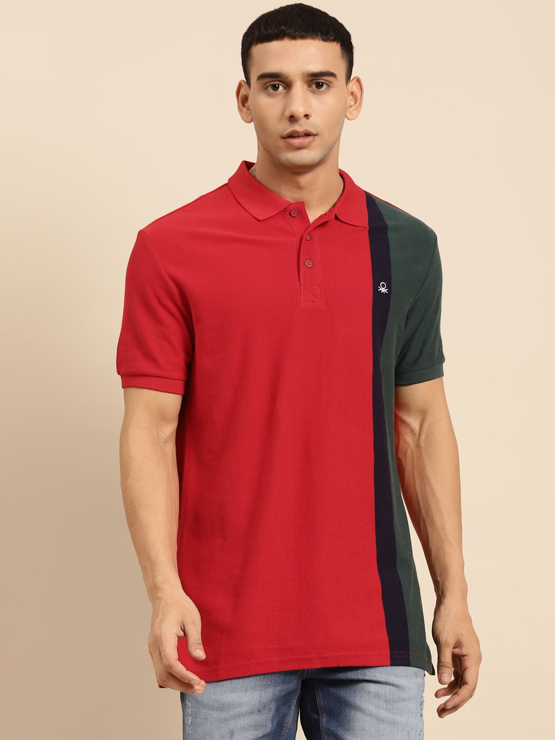 United Colors of Benetton Men Red & Green Colourblocked Polo Collar Pure Cotton T-shirt