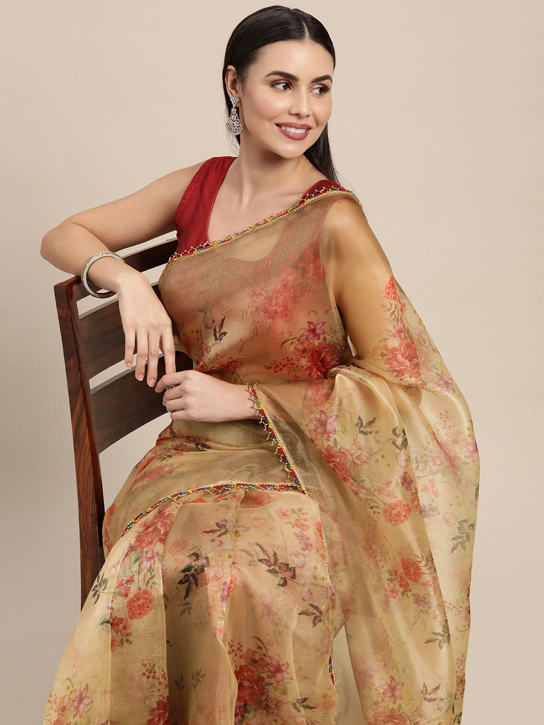 • Design Details Cream-coloured and red saree Floral printed saree with printed border Has sequinned detail The saree comes with an unstitched blouse piece The blouse worn by the model might be for modelling purpose only