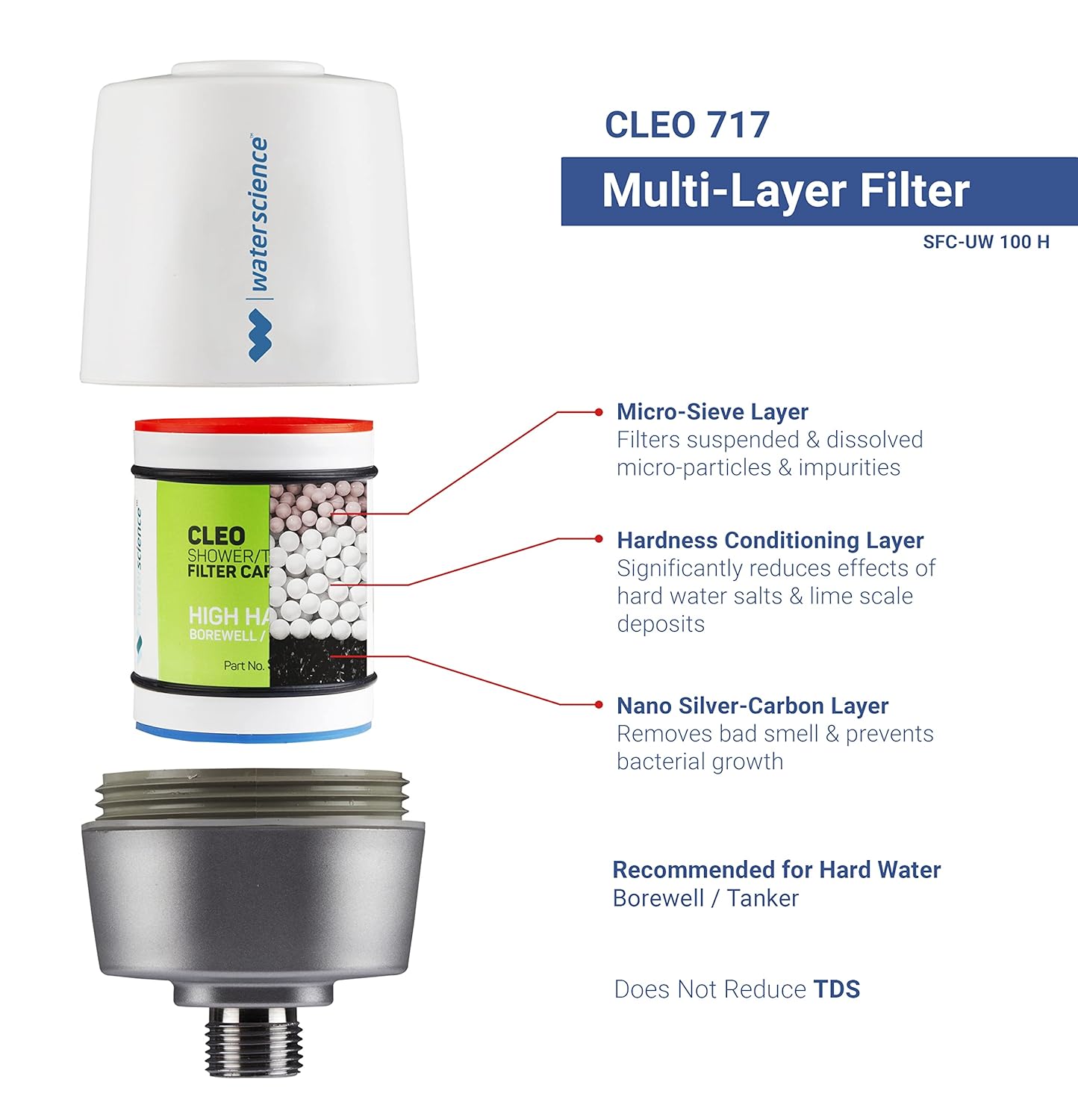 WaterScience CLEO SFU-717 ABS Shower Filter for Hard Water Softening - High Hardness Cartridge for Borewell/Tanker Water