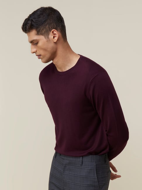 • [Slim fit, Self, Machine Wash, Wine, Crew neck, Model is 6ft/180 cm and is wearing a Medium, Full Sleeves, 80% Viscose, 20% Nylon]